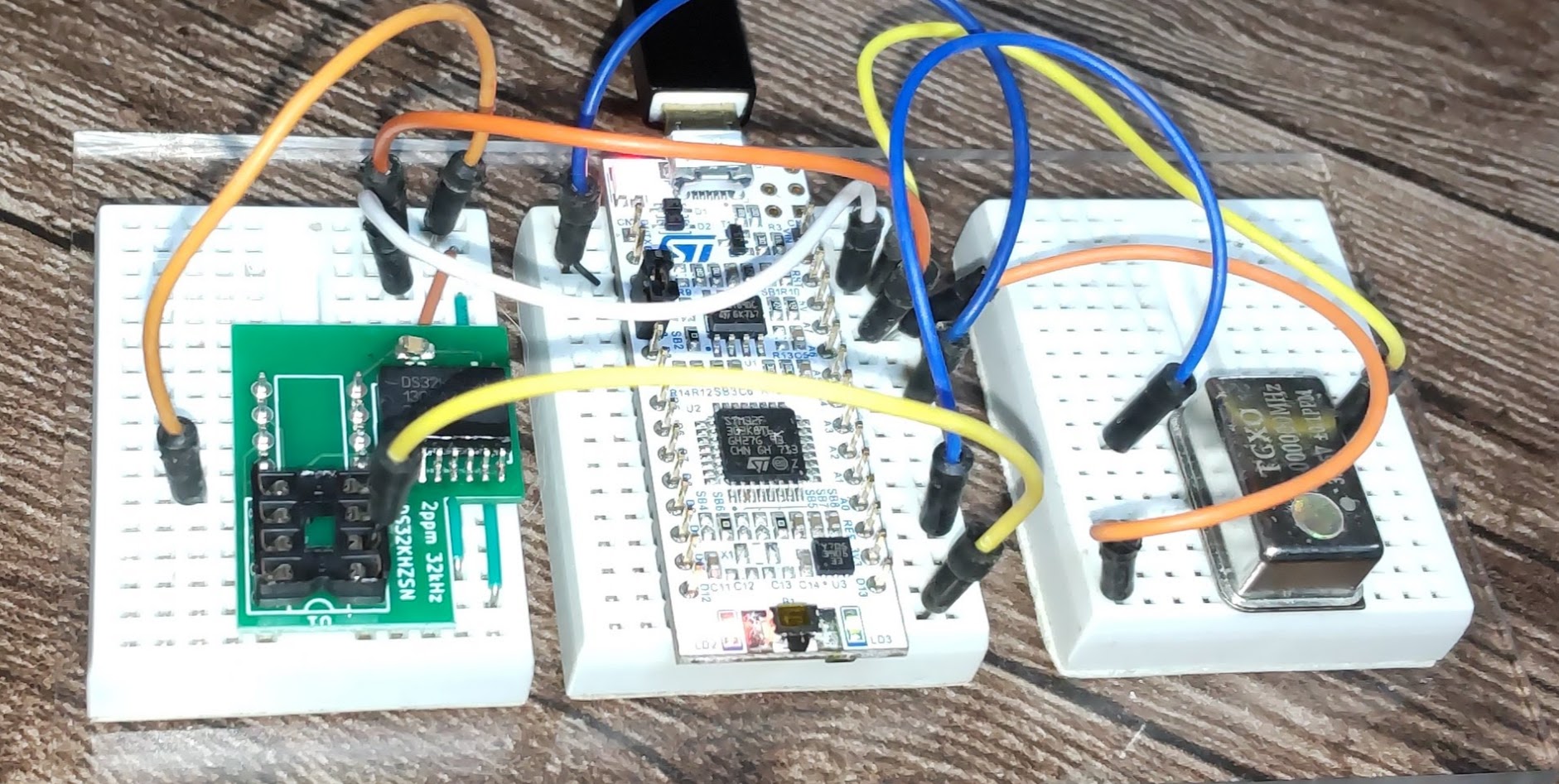 下の写真は、マイコンで構成した高精度に32kHzを測定する試験治具である。こちらはSTM32マイコンを使って外部に高精度のTCXO(1ppm)を搭載して精度の高いカウントパルスを計測対象の信号でゲートタイムを作りパルスカウントして周期計測をして逆算して周波数を小数点以下二けた程度まで測定することで確認している。